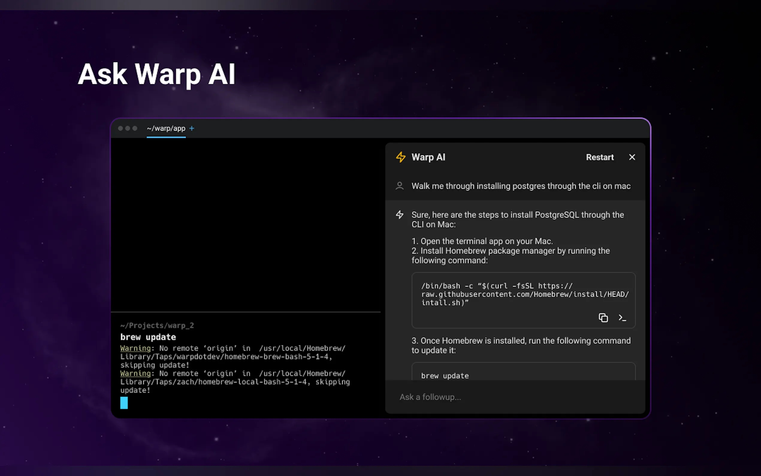 Warp — это современный кроссплатформенный терминал с встроенным AI-ассистентом, блокнотами и кучей фич для разработчиков.